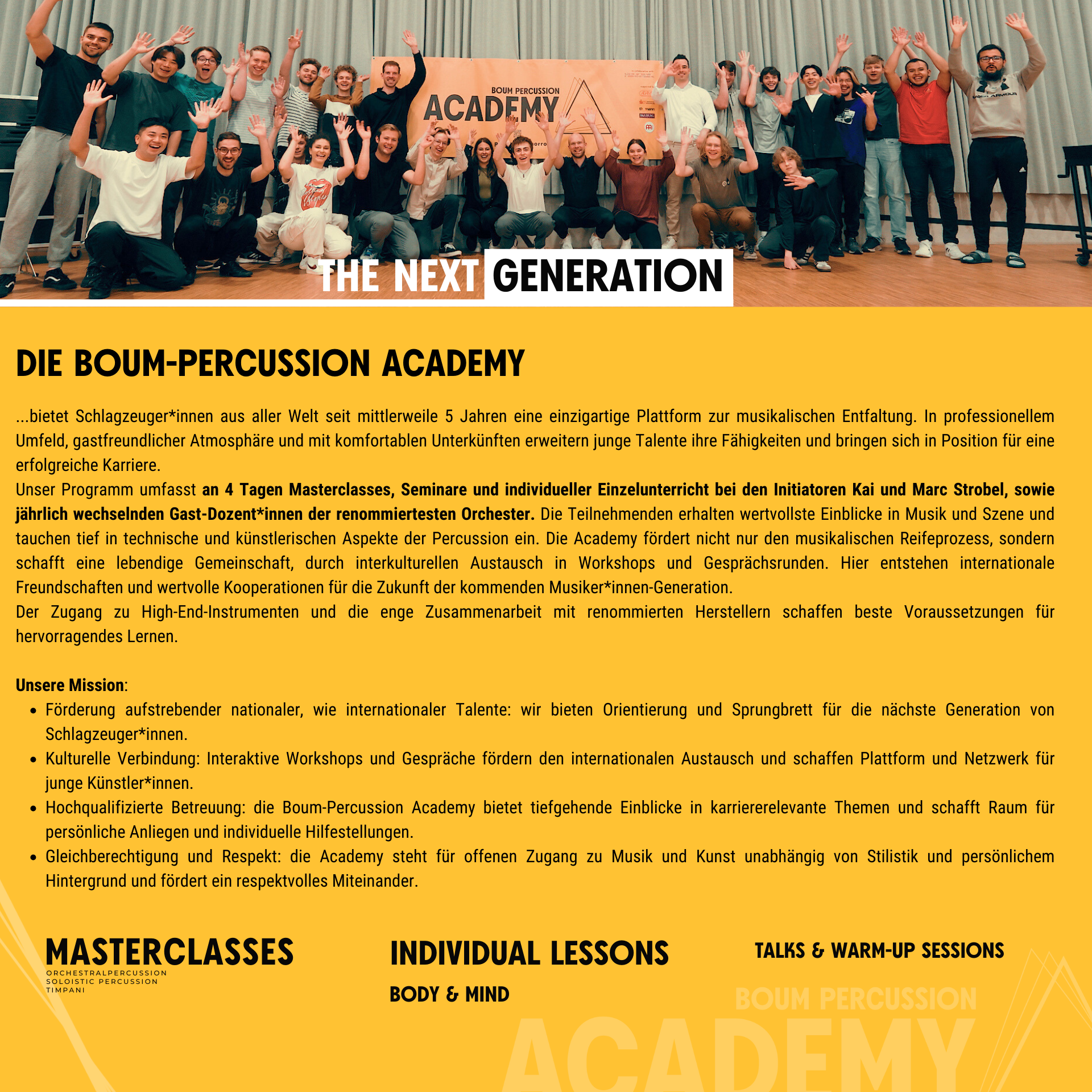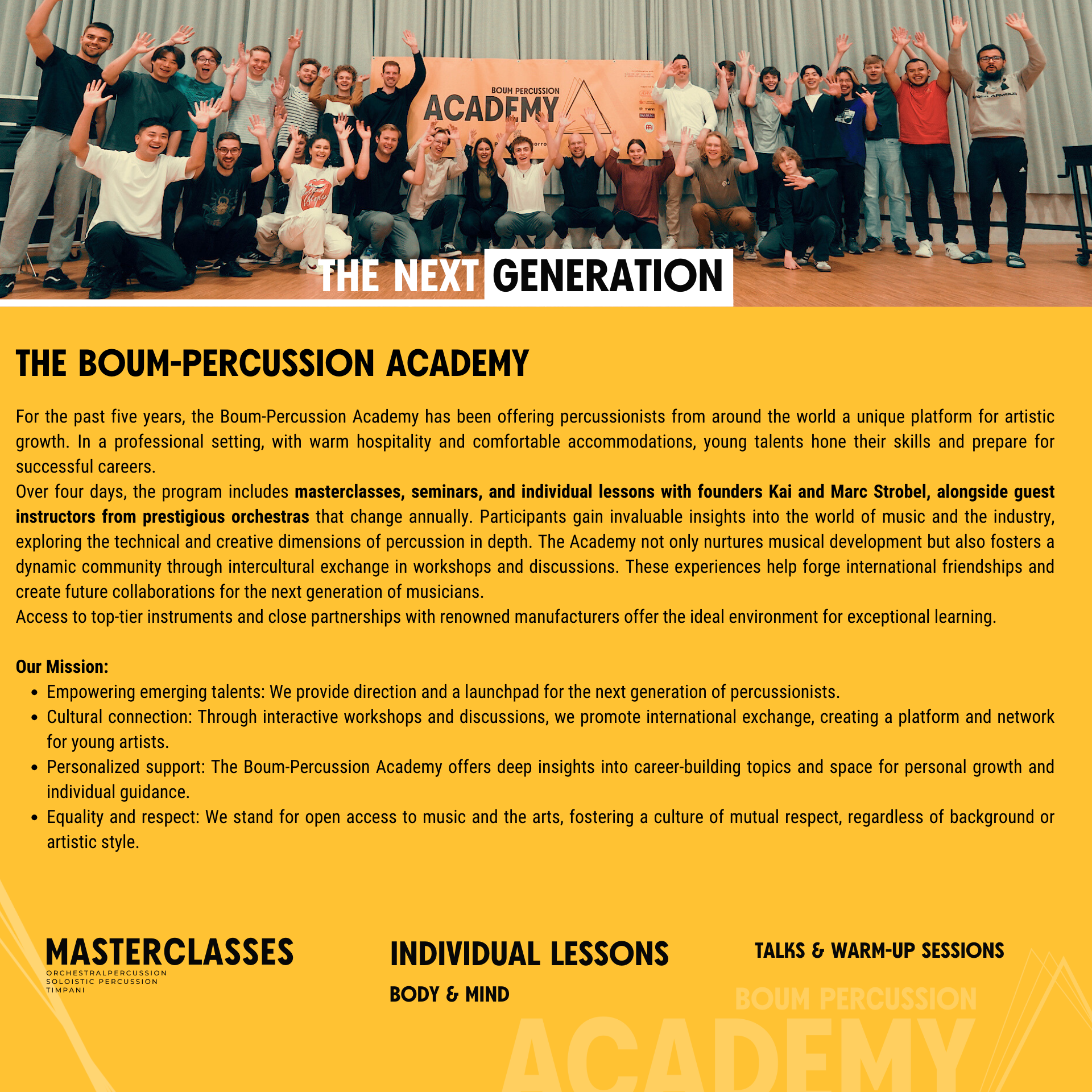 Lerne von herausragenden Musiker-Persönlichkeiten im Bereich Orchesterschlagzeug, Marimba / Schlagzeug-Solo und erweitere dein Wissen und Können in Masterclasses und Gesprächsrunden. Tausch dich aus, mit einer großartigen, internationalen Schlagzeug-Community und lass dich von einem hochprofessionellen aber lockeren Umfeld inspirieren. Connecte dich und knüpfe Freundschaften!